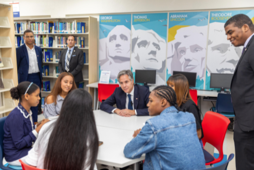 Secretario Estado, Antony Blinken, se reúne con estudiantes Programa Inglés de Inmersión y vicepresidenta Raquel Peña, en el ICDA