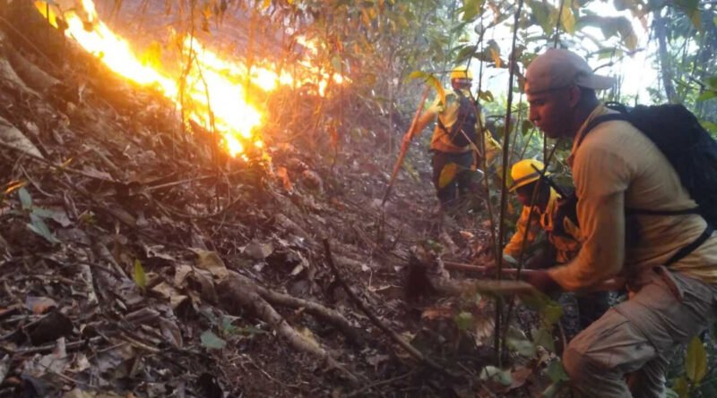 Bomberos forestales trabajan para controlar incendio que afecta montaña en Manabao, Jarabacoa