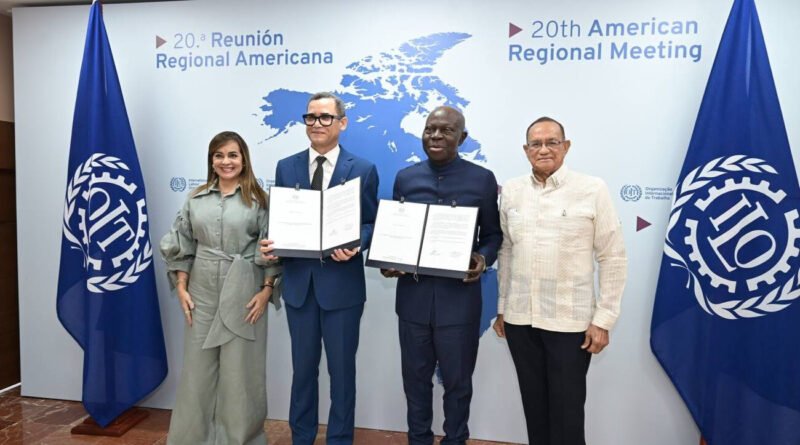 Punta Cana.- En el marco de la 20.ª Reunión Regional Americana de la Organización Internacional del Trabajo (OIT) celebrada en Punta Cana, el ministro de Trabajo de la República Dominicana, Eddy Olivares, entregó en nombre del Gobierno dominicano, al director general del organismo, Gilbert Houngbo, el instrumento de ratificación del Convenio 156 de la OIT, sobre los trabajadores con responsabilidades familiares.