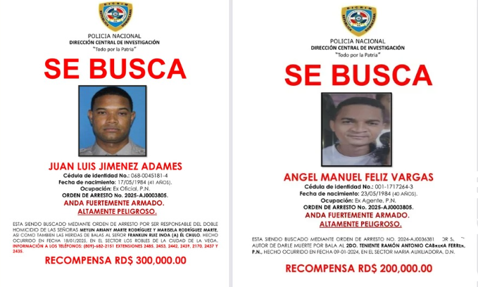 La Policía Nacional ofrece recompensas de RD$300,000 y RD$200,000 por información que permita la captura de Juan Luis Jiménez Adames y Ángel Manuel Feliz Vargas, respectivamente, ambos ex miembros de la institución vinculados a graves hechos criminales.