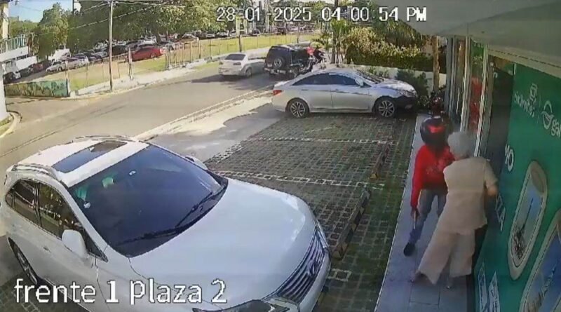 En la filmación se observa a uno de los atracadores, quien portaba un casco protector que le cubría la cabeza, acercarse a la señora que había salido de un vehículo y, cuando se disponía a entrar a un establecimiento, el asaltante le arrebató la cartera. Ambos lucharon, pero finalmente el asaltante logró llevarse el bolso.