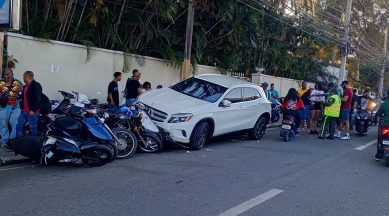 Se registró un accidente durante la celebración del Carnaval Vegano, cuando una jeepeta Mercedes Benz blanca perdió el control y destruyó varias motocicletas en la calle García Godoy, frente a la universidad UNPHU.