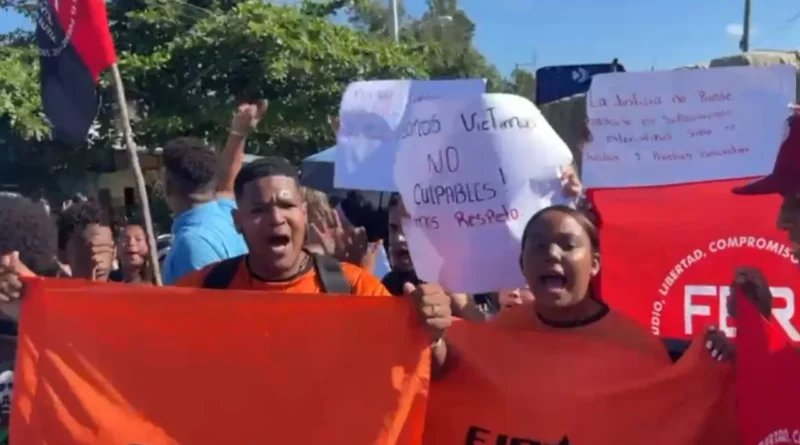 Con pancartas y consignas, padres y grupos estudiantiles mostraron indignación ante las recientes declaraciones del Ministerio de Agricultura en la que indicaron que las mochilas de los estudiantes podrían contener los químicos responsables de las intoxicaciones en el centro educativo José Hernán Sánchez, en San Francisco de Macorís.